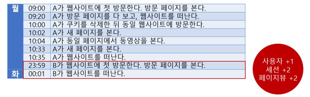 23:59~00:01, 새로운 사용자(사용자 1 카운트) B가 웹사이트에 처음 방문(세션 1, 페이지뷰 1 카운트)합니다. 자정이 넘어 새로운 세션으로 간주하고(세션 1, 페이지뷰 1 추가 카운트) 접속이 종료됩니다.